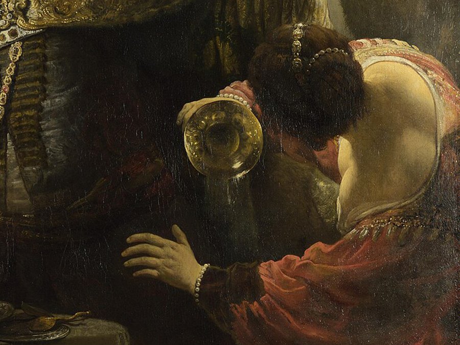 Этот свет ударяет по лицу царя и ближайших к нему участников пира, вырывая их из темноты, в которую погружён остальной зал.