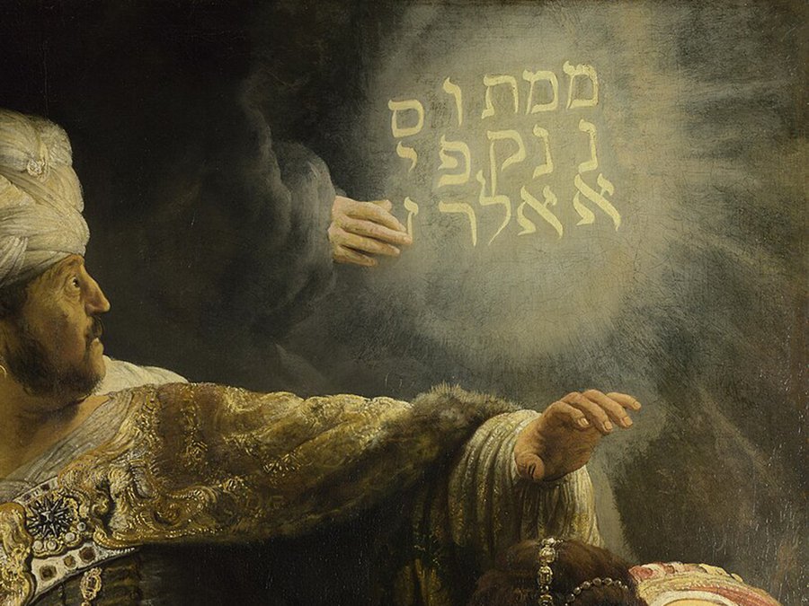 В картине «Пир Валтасара» вся напряжённость сцены строится на резком свете от таинственной письменной надписи на стене.