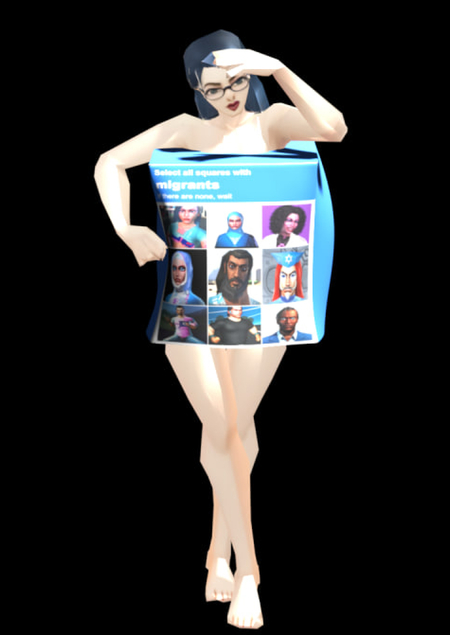 Её тело частично скрыто динамической капчей: чтобы «разблокировать» изображение, зритель должен выполнять жестовые действия через Kinect, отвечая на заведомо нерешаемые задания. Каждая попытка лишь вызывает новую капчу, превращая взаимодействие в бесконечную петлю желания и фрустрации. Инсталляция демонстрирует, как цифровые технологии одновременно обнажают и закрывают, обещают доступ и отказывают в нём, подменяют живой субъект его симулякром. «Будущая Ева» здесь — не женщина, а фантом, который заставляет зрителя доказывать собственную человечность, оставаясь недостижимой и бесконечно перегенерируемой.