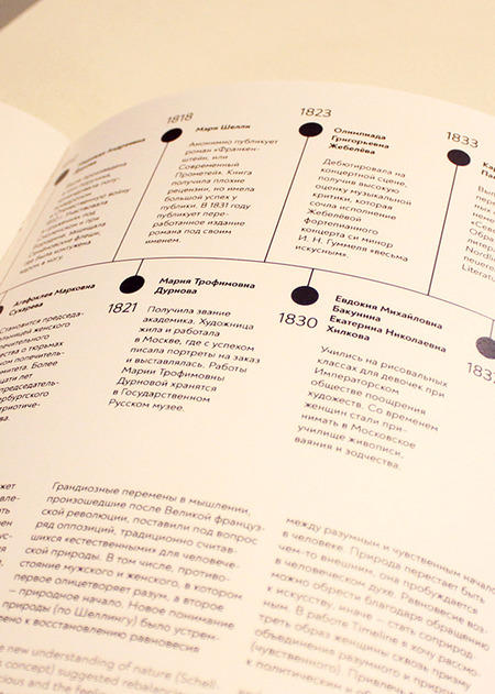 «Timeline» — художественное исследование, направленное на переосмысление исторического нарратива и добавление женского вклада в культурную хронологию. Работа была сделана для выставки «Мечты о свободе. Постскриптум», проходившей в диалоге с экспозицией «Мечты о свободе. Романтизм в России и Германии» в Новой Третьяковке. Форма таймлайна отсылает к исторической шкале эпохи Романтизма на выставке «Мечты о свободе», в котором не было ни одного женского имени. Официальная история, представленная как мужская, в моей работе подвергается критическому осмыслению и «переписывается» через призму женского опыта. В «Timeline» мне хотелось подсветить имена женщин Романтизма — художниц, поэтесс, политических и общественных деятельниц, чьи имена были забыты или проигнорированы, но влияли на ход истории. Проект стал важной частью выставки, определяя её тематический вектор: внимание к женскому авторству, к утраченной видимости и к необходимости нового взгляда на структуру культурной памяти.