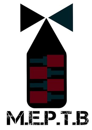 Помести этот логотип на вывеску, которая должна располагаться на кирпичной стене. Вывеска должна светиться. Справа должна быть железная дверь с надписью «danger» на табличке. Пасмурно. Ночь.