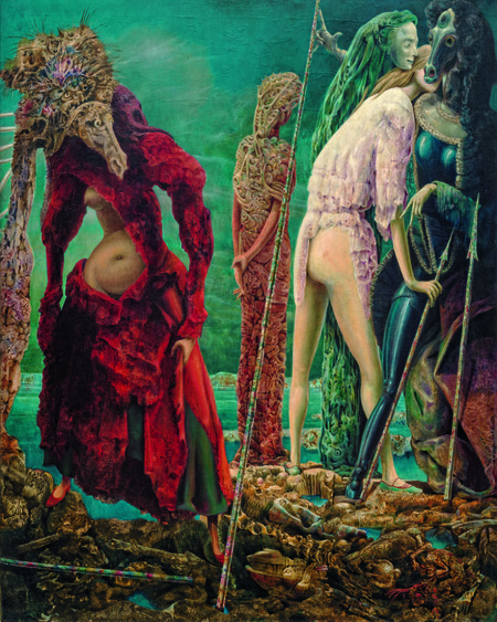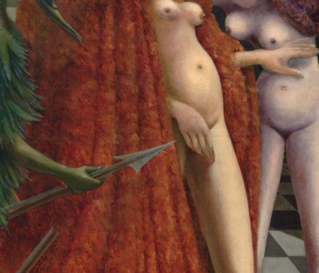 В центре внимания — живот, грудь и походка: плоть выступает как знак плодородия и сексуальности. Одновременно сценическая постановка (поза, свет, архитектурный антураж) как подчёркивает, так и перебивает интимность. Отдельные фрагменты тела — грудь, живот, конечности — функционируют как перформативные элементы: то скрываются, то выставляются напоказ, служат украшением или орудием. Тело показано и как предмет демонстрации, и как защищённый «реликварий» Эротические мотивы (оголённые животы, груди, позы) соседствуют здесь с воинственными и хищными символами — стрелами, шестами, звериными чертами; в этих полотнах Эрнста телесность одновременно влечёт и травмирует. Потому что такое соседство женского мягкого тела с орудиями — мощный визуальный оксюморон.