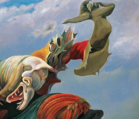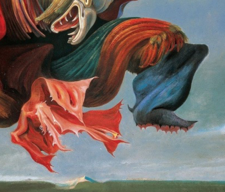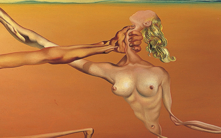 Тело в этой картине не предстает цельным человеческим образом — оно слилось с пейзажем. На переднем плане появляется антропоморфная «птичья» фигура, иногда трактуемая как альтер эго художника, которая, по-видимому, преследует слабо различимую обнажённую фигуру справа, создавая напряжённую смесь эротики и хищничества.