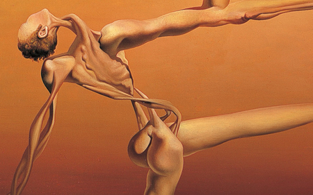 Тело разделенное, растянутое, местами суженное до парадокса, становится не столько анатомическим объектом, сколько переносом внутренней психодрамы во внешнюю форму.