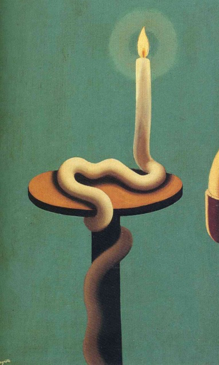 А портрет с трубкой говорит нам о пристрастии. Тело всегда отражает образ жизни, на нем остаются следы от событий (шрамы). То, что курение влияет на тело — факт, но Магритт иронизирует на тему вредной привычки, изображая то, как человек и курительная трубка слились воедино и свеча, которая не имеет конца показывает, что это навсегда.