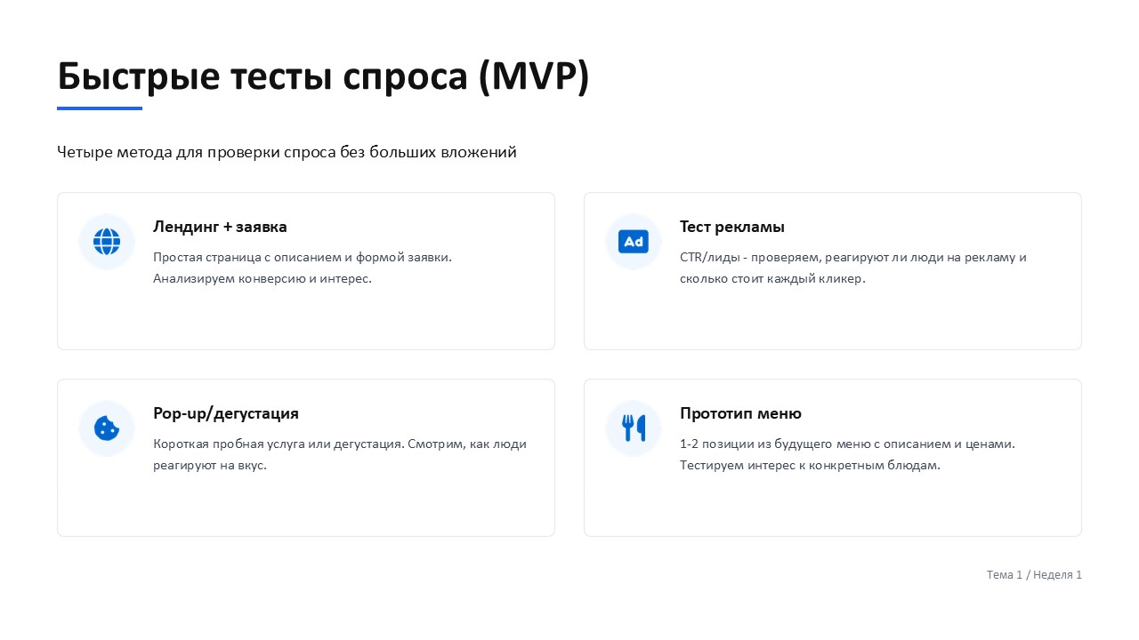 Эта неделя — старт курса и самый важный фильтр всего проекта. Мы не начинаем с выбора названия, меню или красивого интерьера. Мы начинаем с того, что ищем сильную бизнес-идею, проверяем, есть ли под неё живой спрос, и прикидываем, может ли она зарабатывать.
