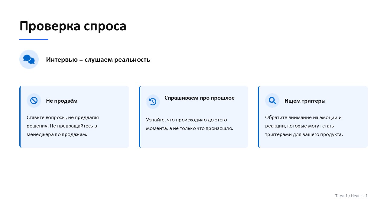 Лучше не тянуть: чем быстрее ты выйдешь в интервью, тем быстрее станет ясно, рабочая ли идея. Если чувствуешь, что интервью «сыпят» идею — это хорошо: дешевле поменять гипотезу сейчас, чем после ремонта и закупок.