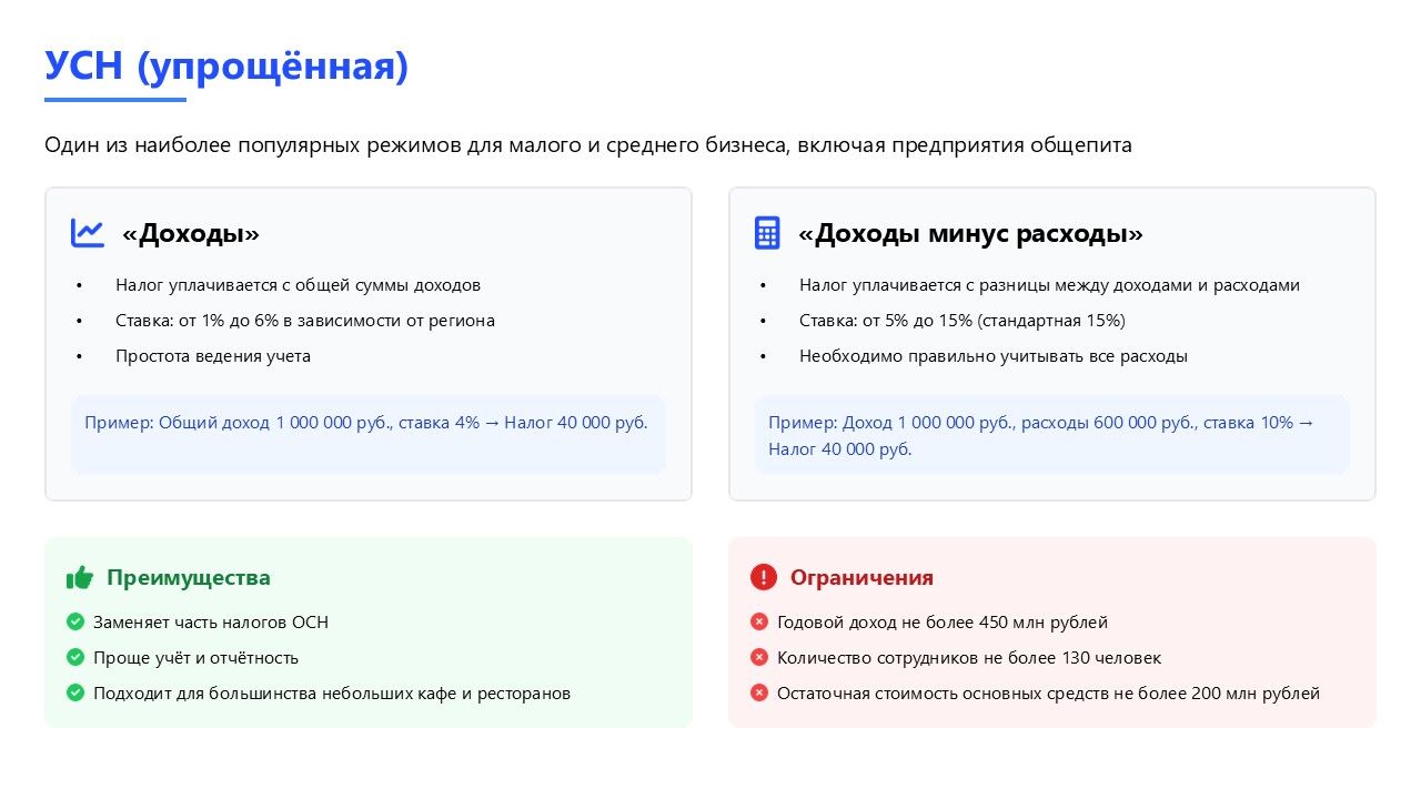 УСН — базовый режим для малого общепита. Тут твой выбор зависит от доли расходов: если их много и ты готова их подтверждать — обычно лучше «доходы минус расходы». Если расходов мало или сложно подтверждать — «доходы».