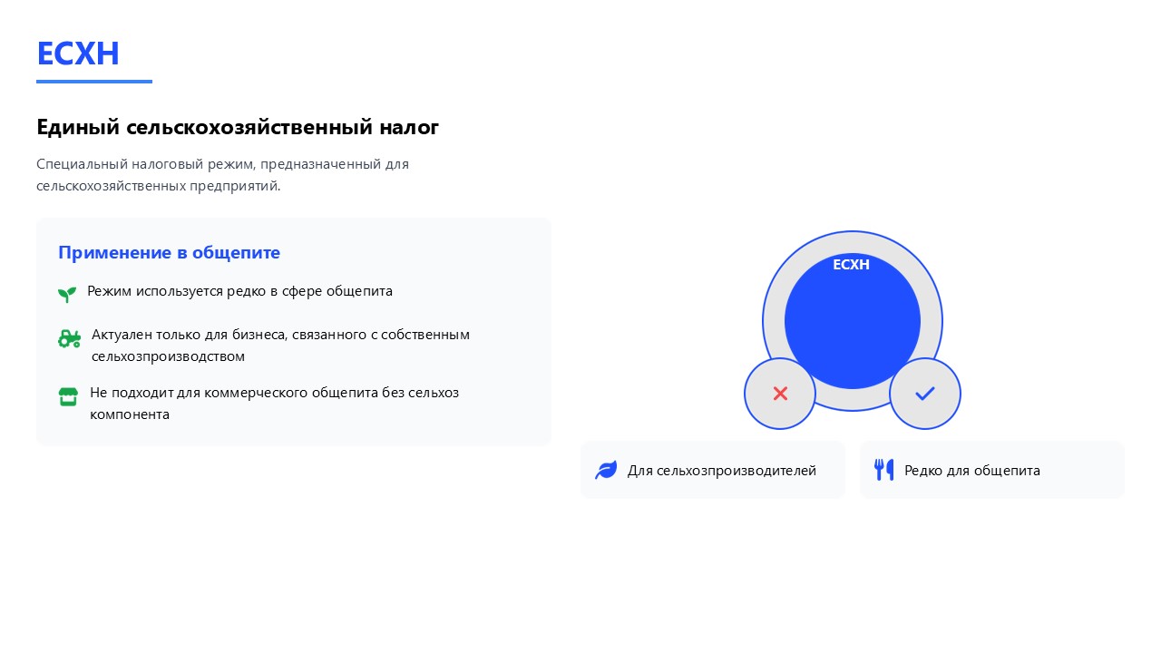 ЕСХН — нишевый режим. Он актуален, если точка напрямую связана с сельхозпроизводством (ферма/сыроварня/свой продукт). Для обычного кафе — нет смысла.