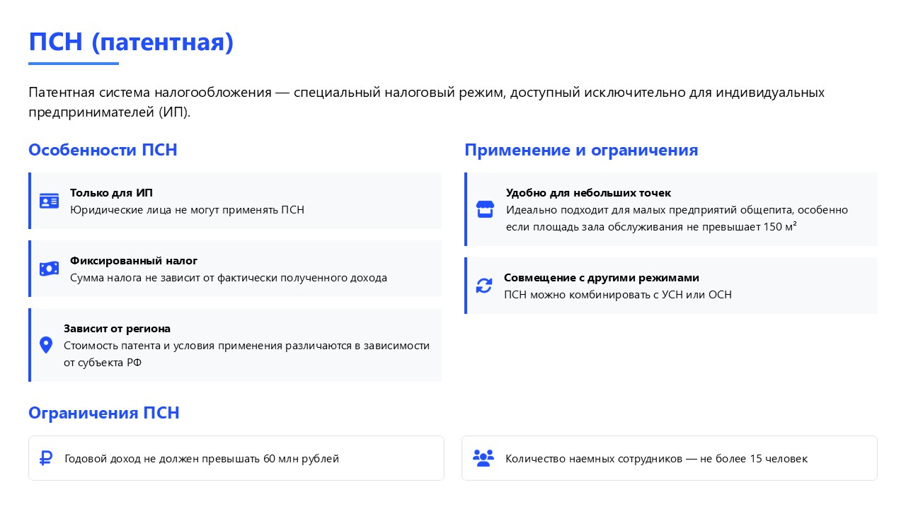 Патент — сильный режим для небольших точек на ИП. Он удобен фиксированным налогом, но имеет лимиты по площади/выручке/сотрудникам и зависит от региона.