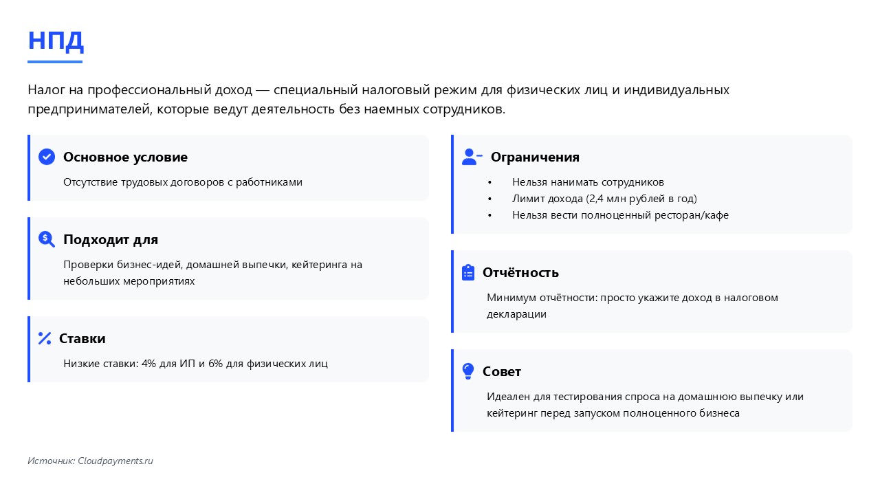 НПД — это налоговая часть самозанятости. Используй его, когда тестируешь спрос малыми объёмами без команды. Для полноценной точки он не подходит.