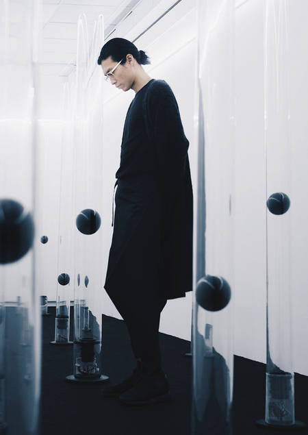 Для создания этой работы были сконструированы несколько стеклянных труб, в которых встроены маленькие чёрные шары и именно оттуда выводится звук.