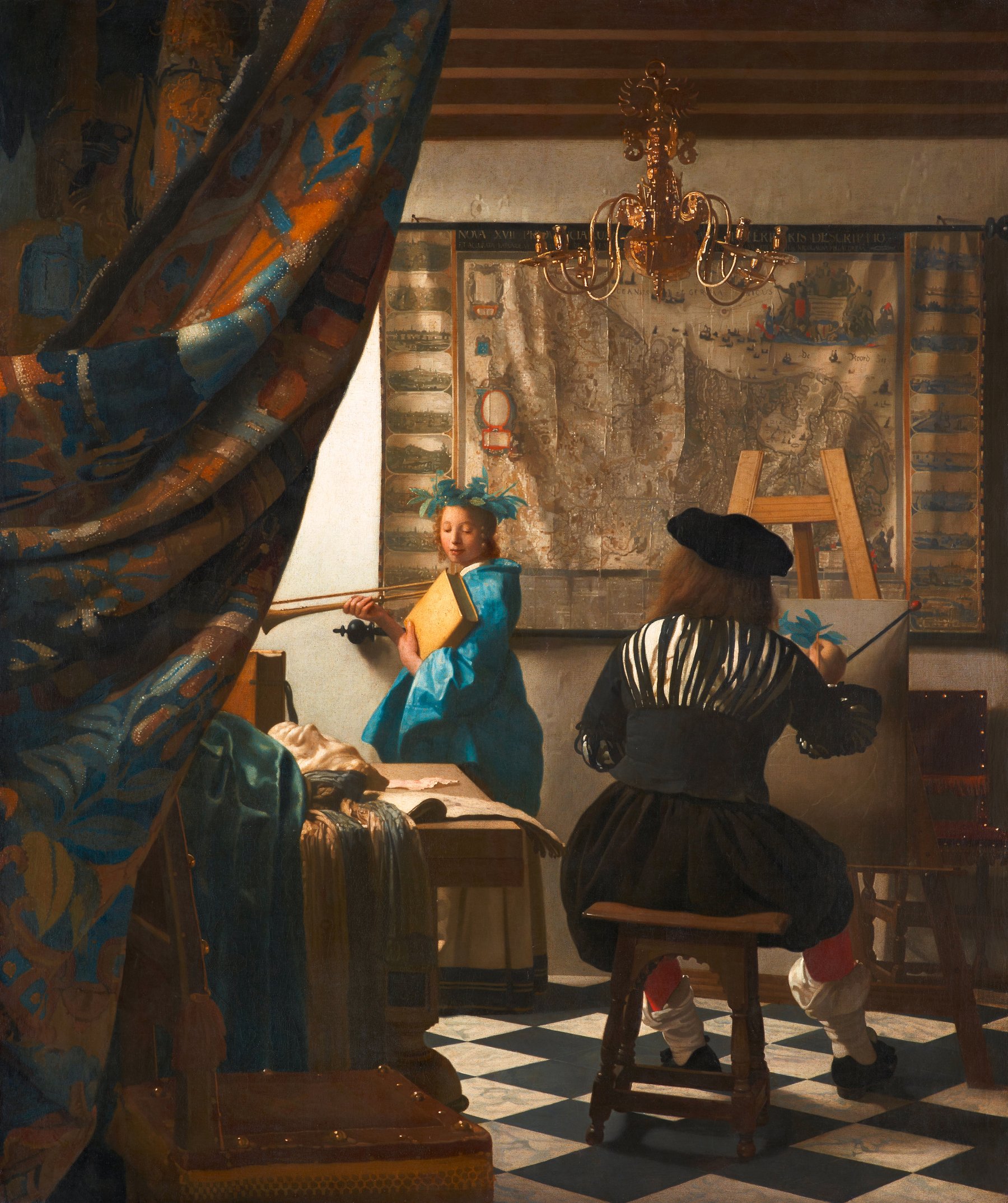 Художник сосредоточенно работает у мольберта в своей мастерской, запечатлевая стоящую у окна молодую женщину в венке из лавра, с трубой и книгой в руках… Этот сюжет, созданный Яном Вермеером в период Золотого века голландского искусства между 1666 и 1668 годами, носит название «Аллегория живописи» (или «Художник в мастерской»). Однако это не просто жанровая сцена; произведение наполнено глубоким аллегорическим смыслом. Натурщица олицетворяет древнегреческую музу истории Клио, а образ художника становится вневременным архетипом творца. Это гимн живописи, размышление о том, как искусство способно запечатлевать мимолетное и преобразовывать его в вечное.