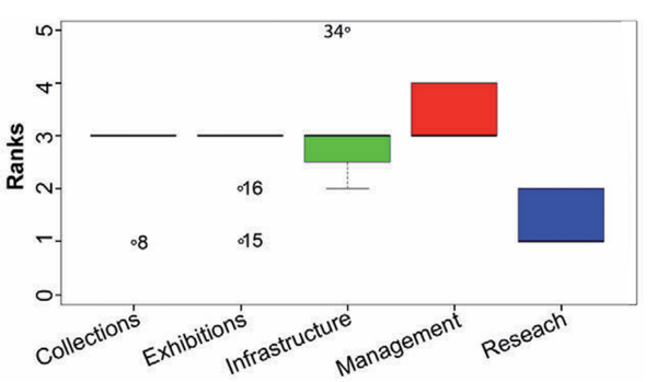 The pie-chats above shows a detailed assessment for Buganda Museum (A) and Great Lakes Museum (B) and Igongo Museum collections, exhibitions, management research and infrastructure. Despite the slight difference in Rankings, they all have a common goal of restoring and preserving the African collections.