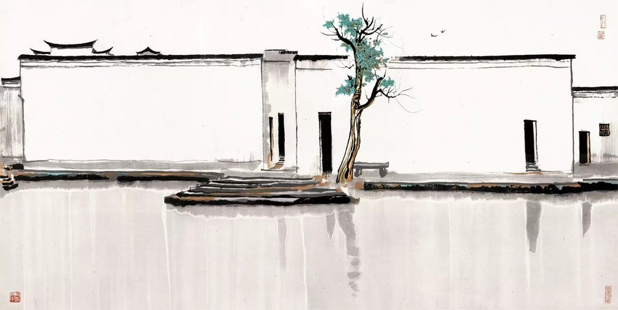 Параллельно с созданием нестандартных для жанра китайской живописи работ У Гуаньчжун рисует минималистичные монохромные картины, изображая на них архитектурные строения своей родины, провинции Цзяннань. Картины, пропитанные ностальгическим настроением, «воплощали китайский эстетический идеал „поднявшегося из воды лотоса“, описанный философом Цзун Байхуа, т. е. тяготели к естественности и бесцветности»[6].