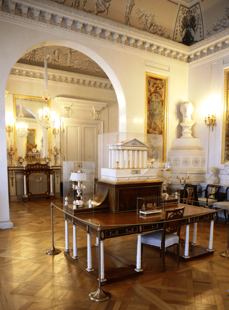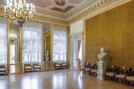 Росси создает здесь пространство, которое говорит языком державной архитектуры. Интерьеры более строгие, масштабные, рассчитанные на парадные приемы и официальный статус резиденции. Ритм колонн, вытянутые анфилады, торжественные пропорции — все подчинено идее представительности.