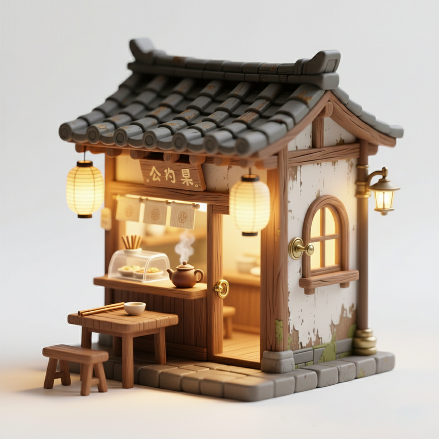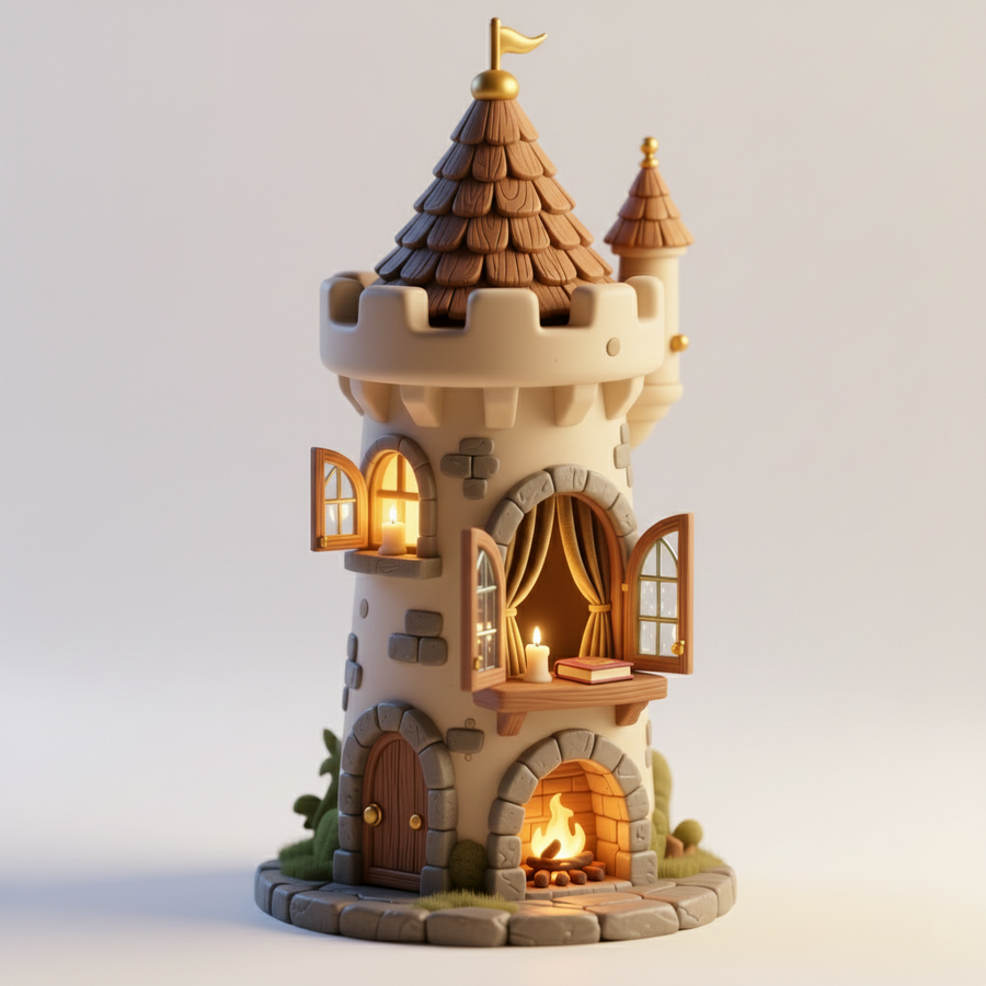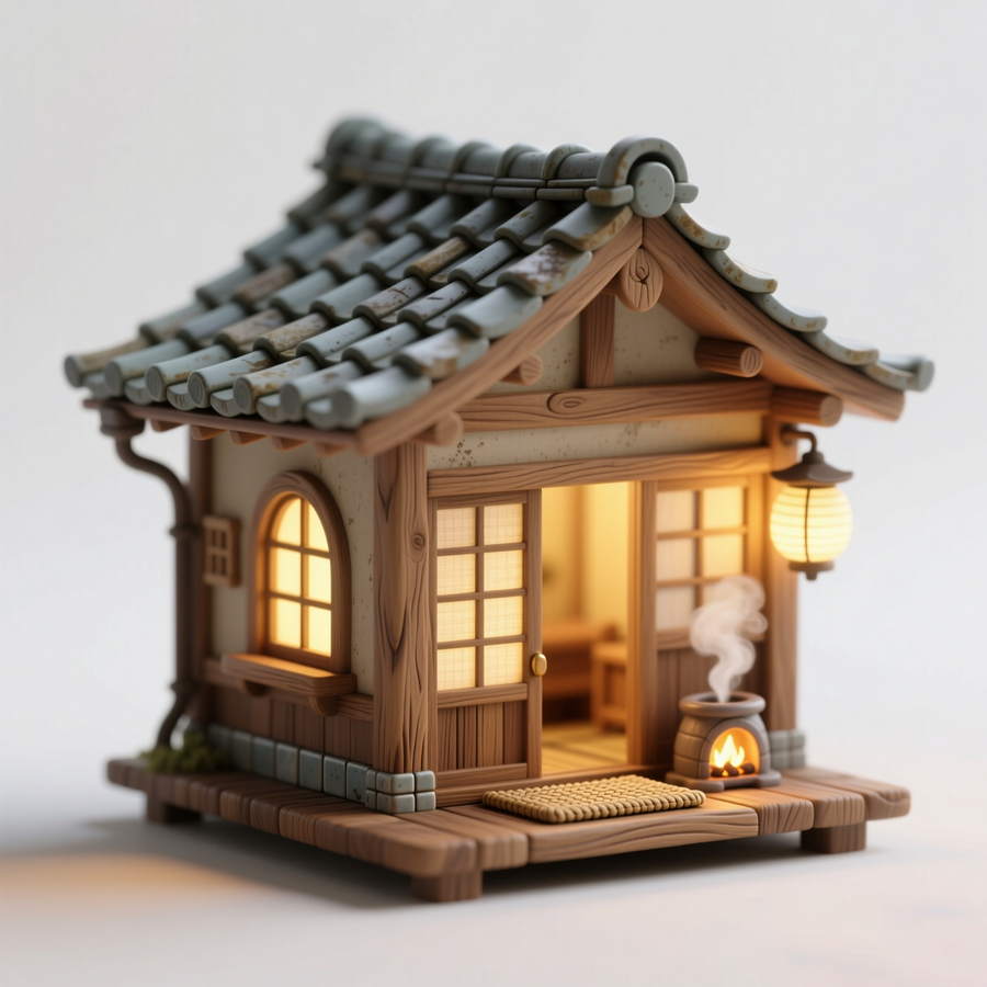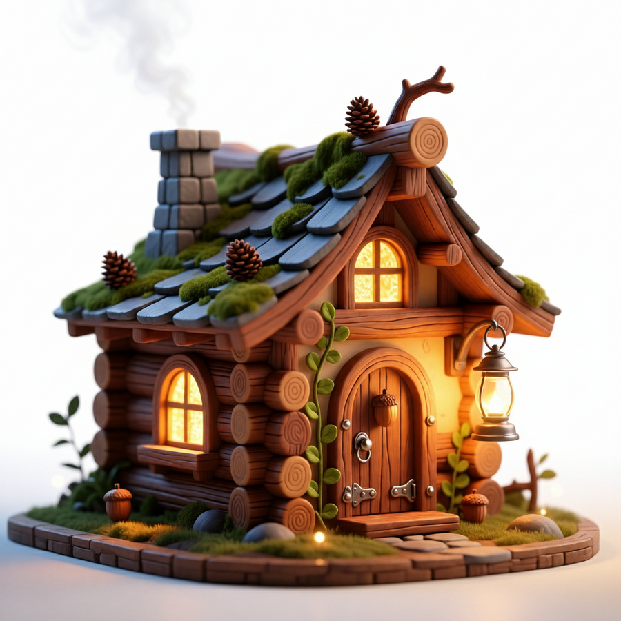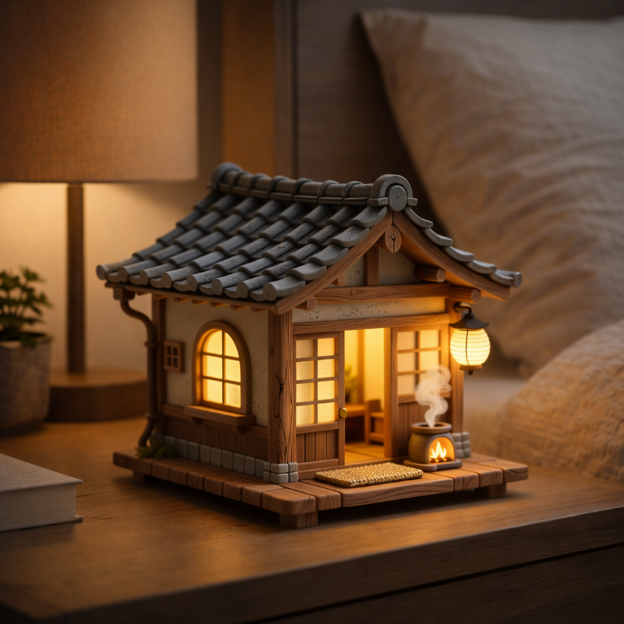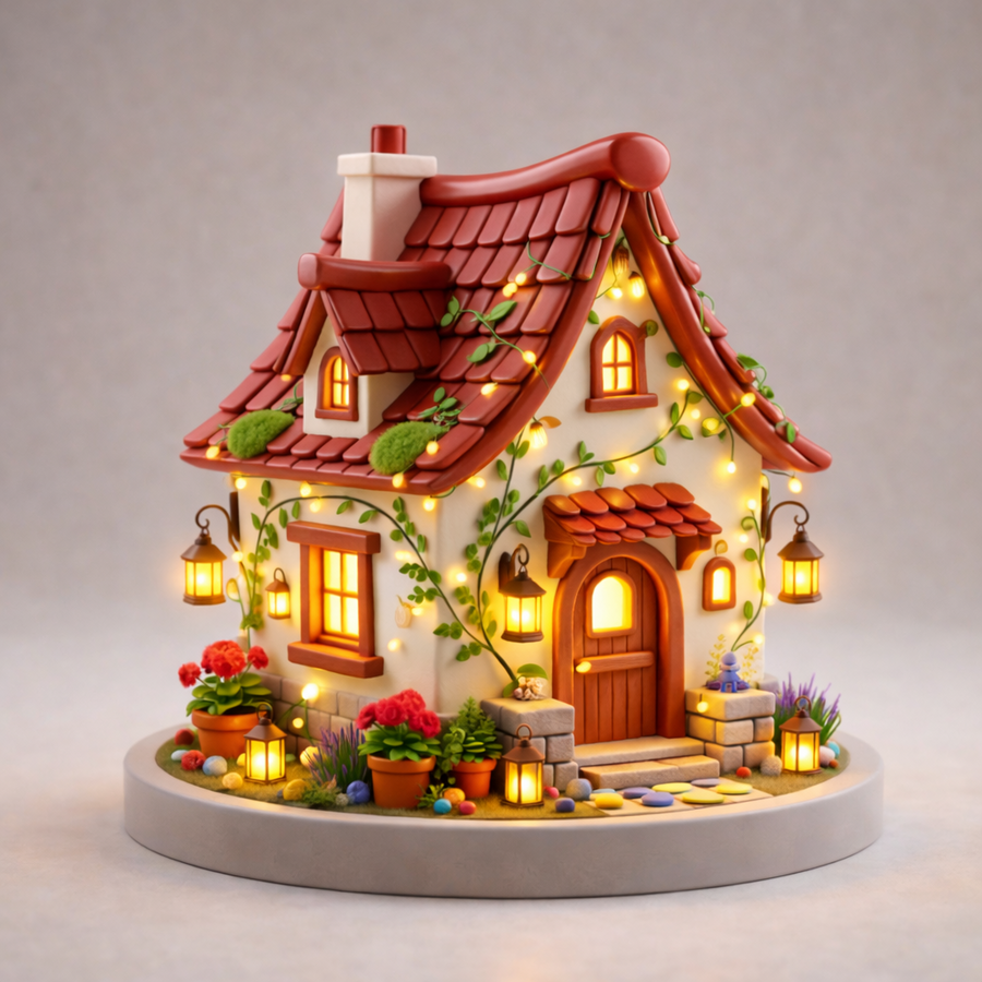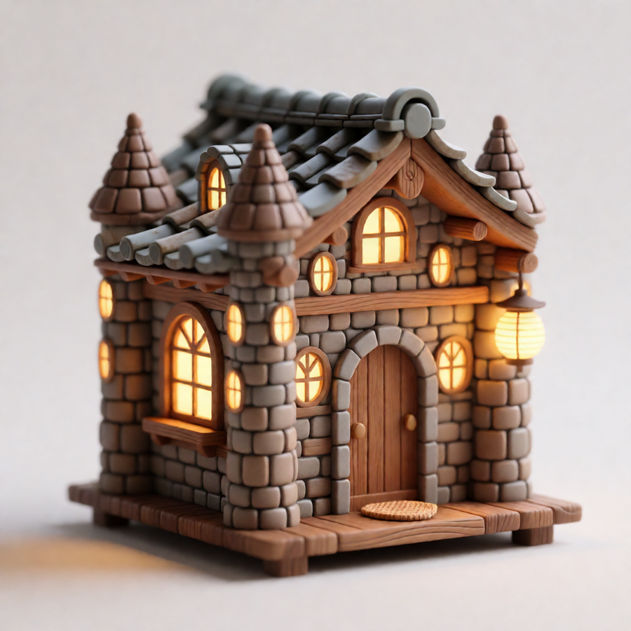 Промт: Concept design of a cozy miniature architectural night lamp from the «Cozy Worlds» collection. A small house-shaped lamp with cute but detailed design, soft rounded shapes, slightly fairy-tale style, warm glowing light coming from the windows and doors. The house looks inhabited and safe. Clean neutral background. Shown as a product concept for future 3D modeling. High detail, realistic materials, soft ambient lighting, charming and cozy atmosphere, design reference image.