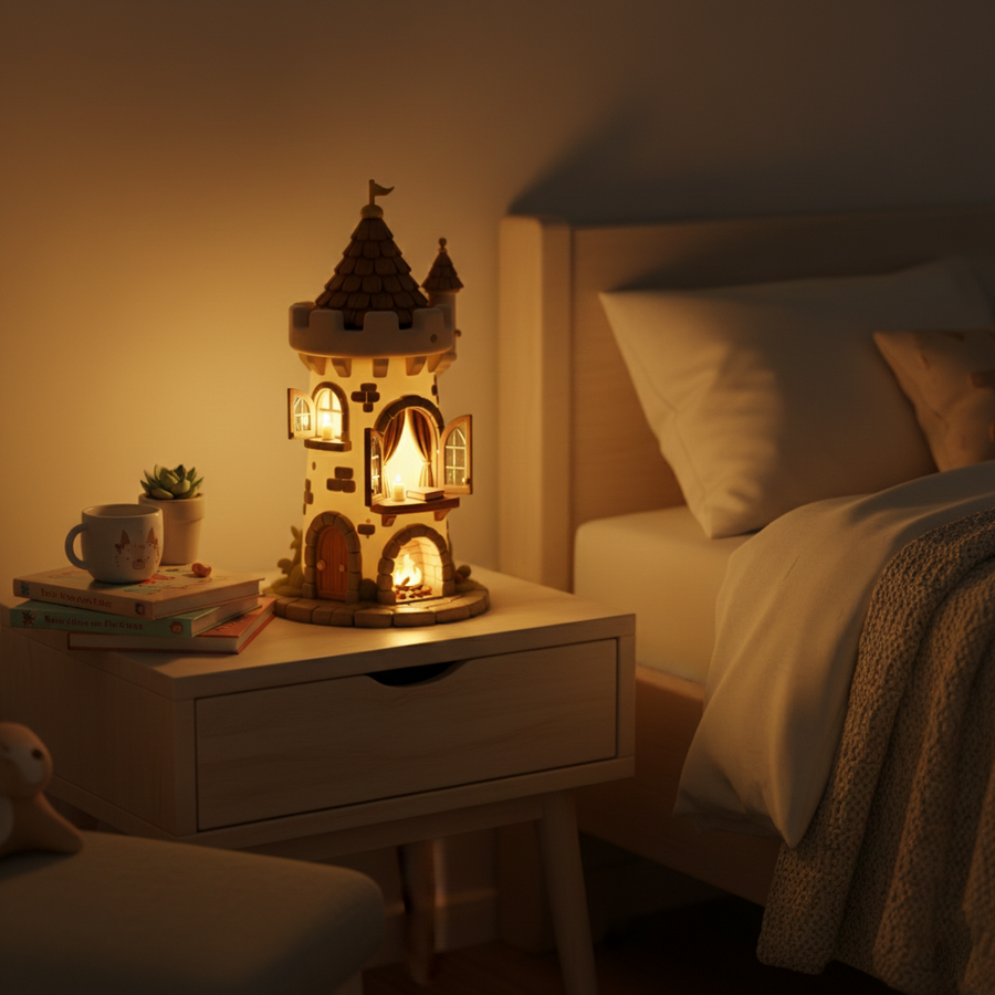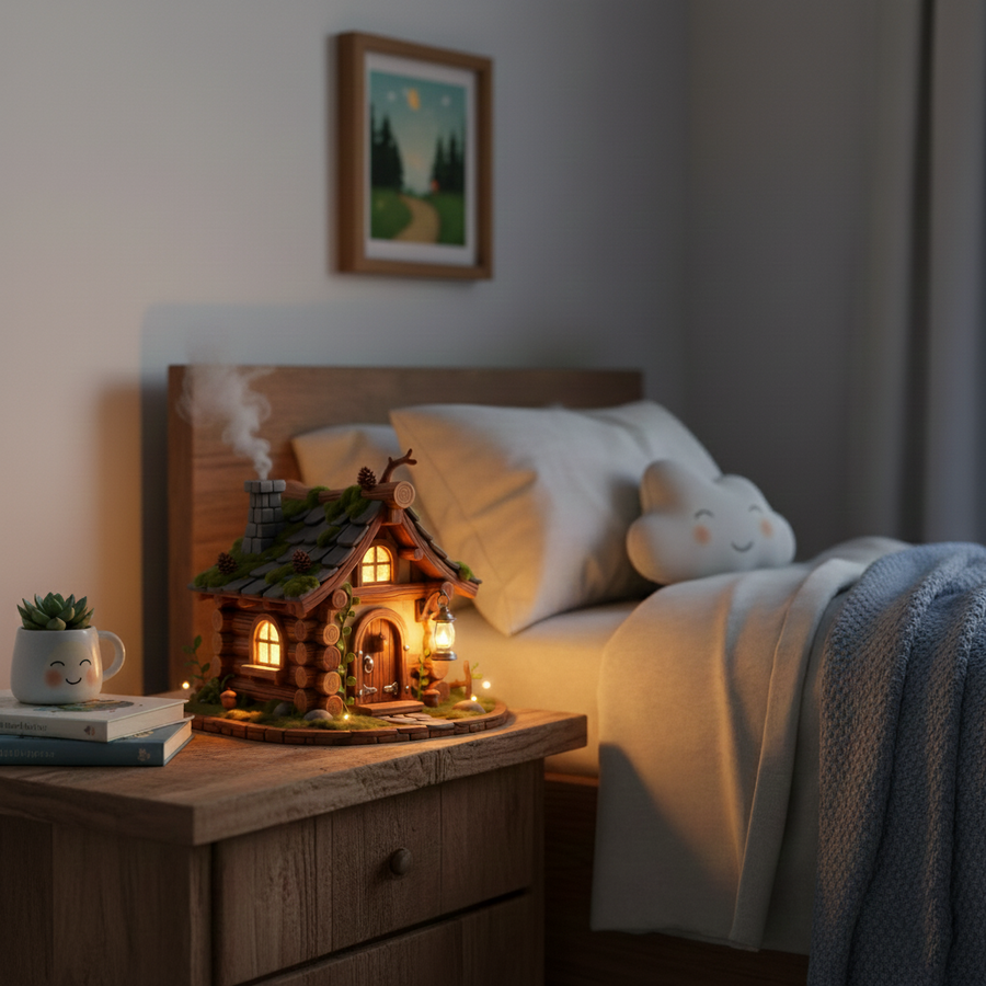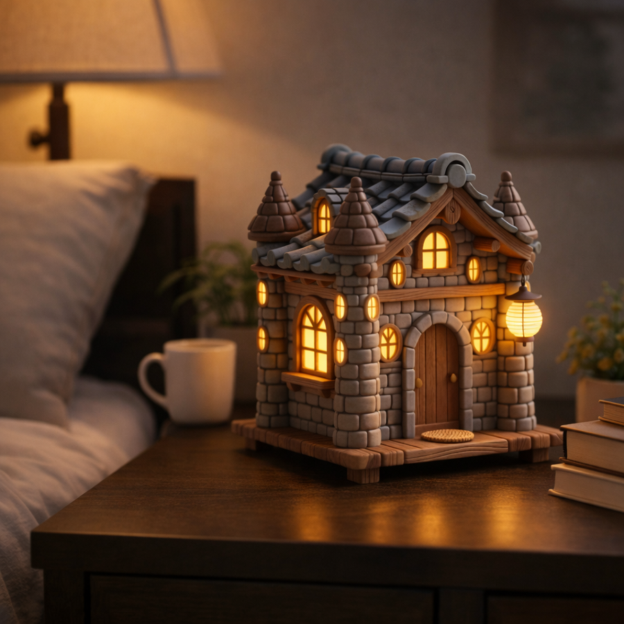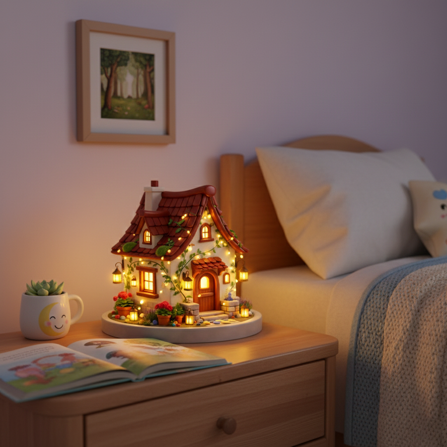 A cozy interior scene showcasing a miniature house night lamp placed in a real home environment. The lamp is standing on a bedside table / nightstand / desk, softly glowing with warm yellow light. Evening or night atmosphere. Surrounding elements include a bed with light bedding, books, a cup, small plants, soft textiles, and subtle decor objects. Gentle ambient lighting, shallow depth of field, calm and intimate mood. The house lamp is the main focus, clearly visible, looking like a decorative night light for a bedroom or child’s room. Clean, realistic interior, soft shadows, warm color palette, cozy and comforting feeling. Product presentation style, suitable for a lifestyle photo. Children’s bedroom, fairy-tale mood. the House lamp is the main focus, soft depth of field, warm glowing light from inside the house