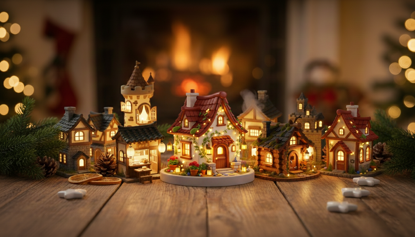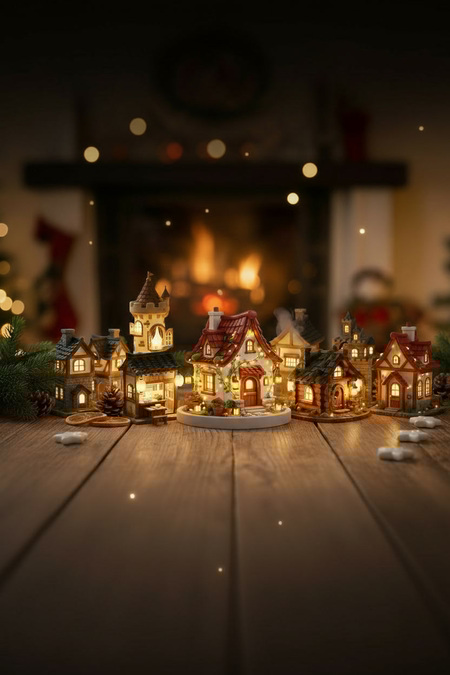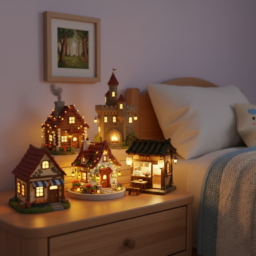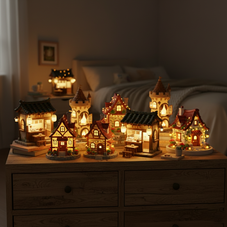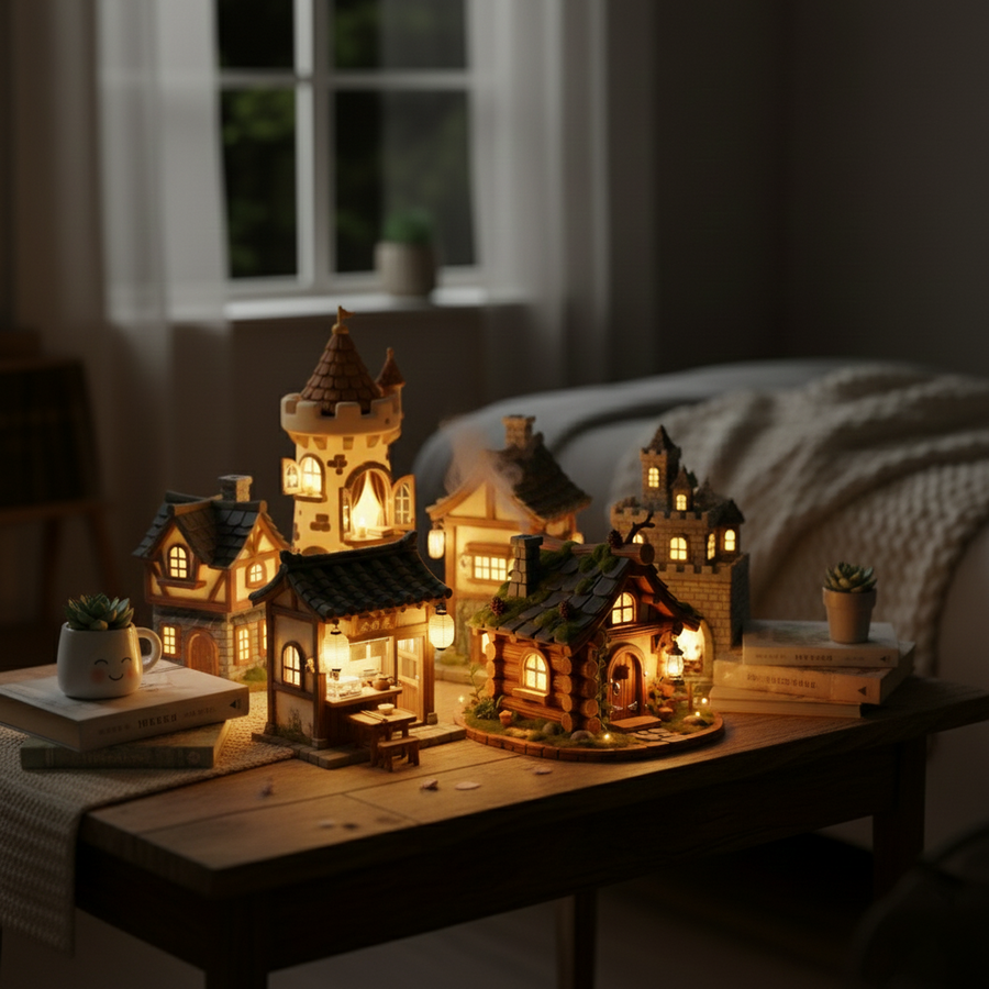 Промт: A cozy home interior scene featuring a collection of miniature house-shaped night lamps from the «Cozy Worlds» series displayed together. Several different architectural house lamps (medieval castle, forest cabin, traditional house, tower, village house, small shop) are arranged harmoniously on a wide bedside table, shelf, or dresser. Each lamp softly glows with warm yellow light from inside, creating a unified, calm nighttime atmosphere. The houses are distinct in shape and style but share the same cute, toy-like, detailed design language. Soft ambient lighting, shallow depth of field, warm color palette, fairy-tale bedtime mood. Clean, cozy home background with subtle decor elements slightly blurred. Product lifestyle presentation, collectible series showcase.