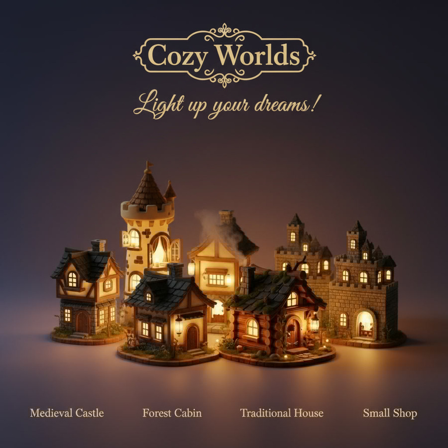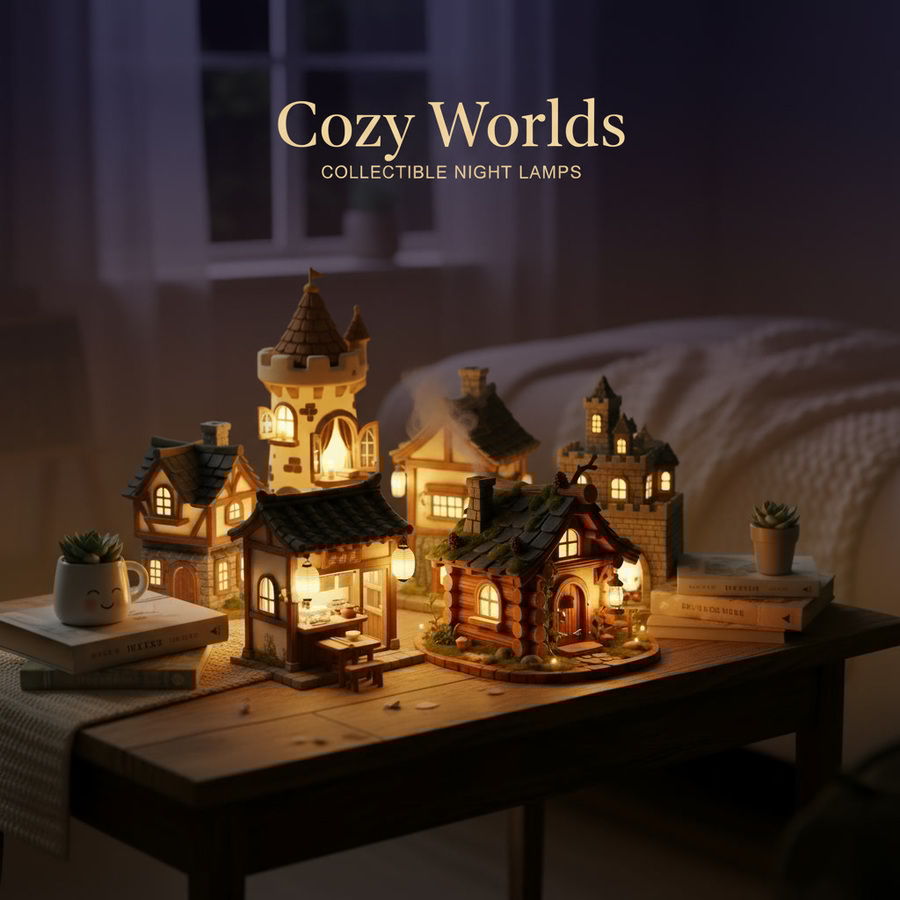 Промт: Advertising poster design for a collectible series of miniature house-shaped night lamps called «Cozy Worlds». All six house lamps are displayed together as a unified collection: medieval castle, castle tower, forest cabin, traditional house, village house, and small shop. The houses softly glow with warm yellow light from inside, creating a magical bedtime atmosphere. The composition is balanced and visually clear, with the lamps arranged like a small glowing village or in an elegant showcase layout. Cozy, fairy-tale, child-friendly mood. Soft dark-to-warm gradient background, evening or night ambiance. Clean product-focused composition, premium yet warm design. High-quality 3D render style, suitable for a brand poster or promotional image.