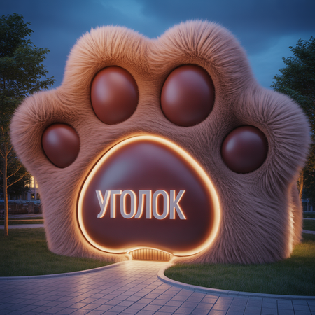 Hyper-realistic photo of a secret pet club called УГОЛОК. The building has a bizarre shape, similar to a giant fluffy cat’s paw, gently squeezes into the city park at dusk. The «fur» is made of ultra-soft textured materials such as plush velvet and matte suede, in shades of brown and cream. The design is organic and rounded, and the entrance is artfully hidden in the curve of the central «toe» made of smooth burgundy polished resin, which glows attractively. A discreet, elegant 3D sign with the word «УГОЛОК» in a sleek, modern font is applied to resin. View of the clubhouse from above. It’s night outside