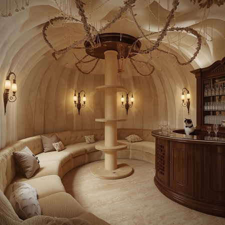 Hyper-realistic photo of the luxurious interior of the secret pet club «УГОЛОК». The space is located inside a giant «cat’s paw» structure, and the curved soft walls are covered with fluffy velvet in the color of beige fur. Low modular sofas in cream and oatmeal colors with soft cushions in the shape of fish and mice are suitable for creatures of all sizes. The central detail is a majestic wooden scratching post, which simultaneously serves as a staircase to the sleeping area on the mezzanine. Warm golden light comes from Art Nouveau wall sconces in the shape of curled tails and from graceful garlands hanging from the ceiling and imitating constellations. A sophisticated British shorthair cat in a tiny bow tie «works» behind a miniature dark oak bar, where sparkling water and treats are served in glass cups.