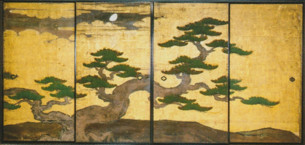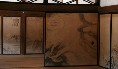 Фусума с традиционной японской живописью тушью. Современное фото; Фусума с росписью «Сосны» — японская традиционная декоративная панель. Современное фото
