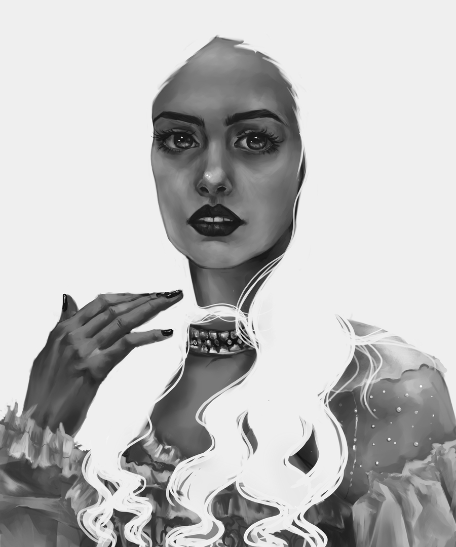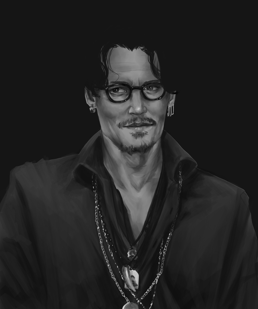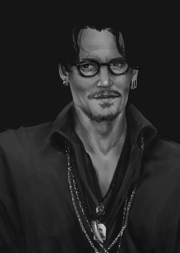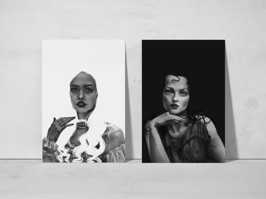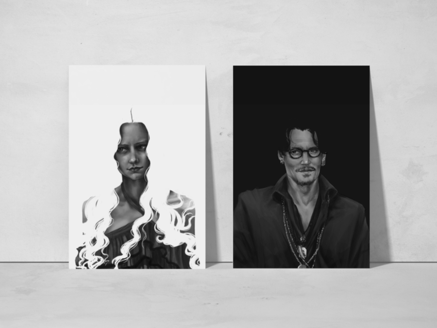 Серия портретов, вдохновленная фильмом Тима Бёртона «Алиса в стране чудес». В своих работах, я решила сделать ключевой акцент на лицах актеров, сделав их максимально живописными, в то время как фон залит одним пятном. Помимо этого, было решено использовать монохромную гамму, что помогло лучше проработать силуэты актеров, к тому же, в сказках часто всё принято делить на черное и белое, а такой «монохромный» метод помогает раскрыть иную сторону — не всё так однозначно, во всем есть множество тонов, нет только черного или только белого, зачастую, всё гораздо глубже и страннее.