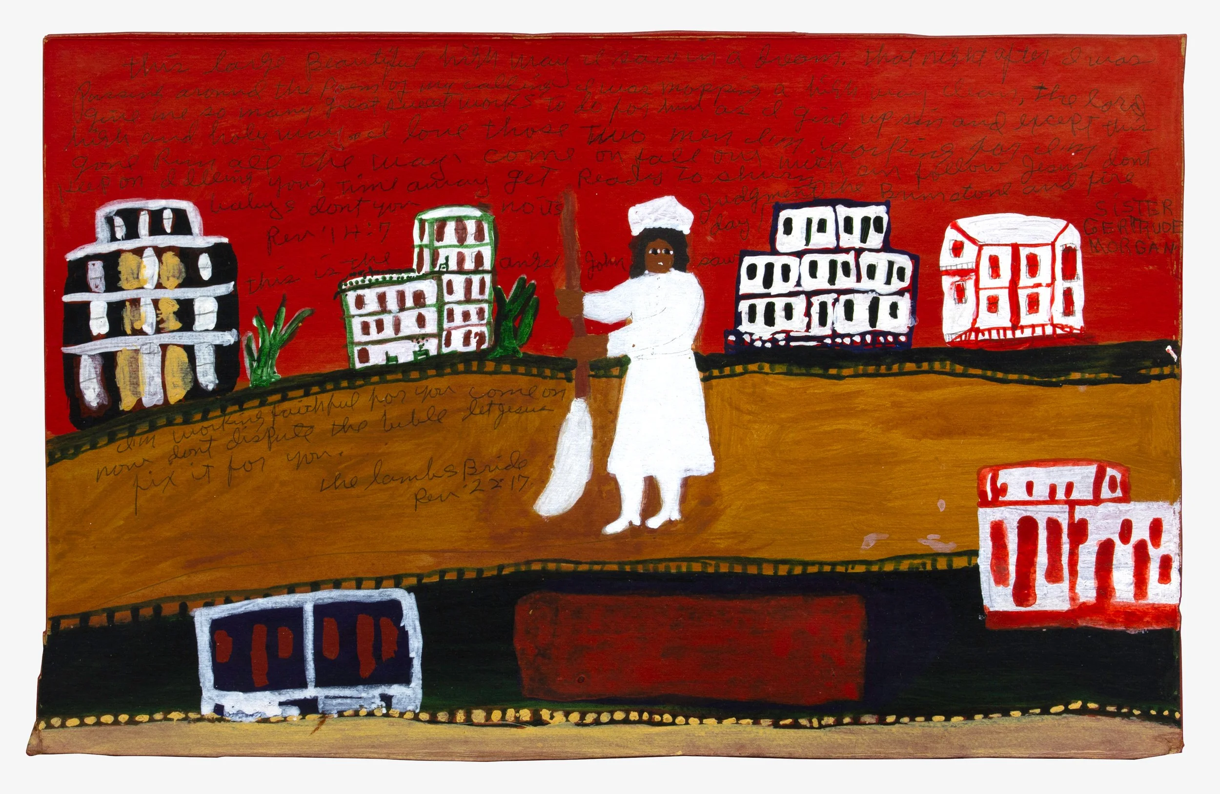 Сестра Гертруда Морган (1900–1980) также пережила божественное откровение — в 1934 голос Бога велел ей: «Иди и проповедуй — расскажи миру!». Она проповедовала и пела, пока в 1956 году, в возрасте 56 лет, не начала рисовать. Морган не считала себя художницей. Но она расписывала всё, что попадалось под руку: двери, коробки от стирального порошка, поддоны из пенопласта, туалетную бумагу, гитарные кейсы, картонные мегафоны. Каждая поверхность становилась холстом для евангельского послания.