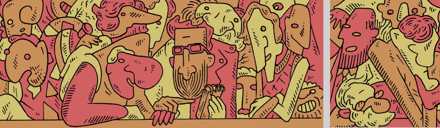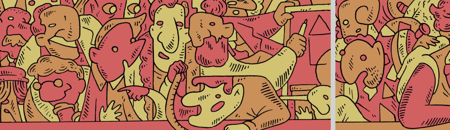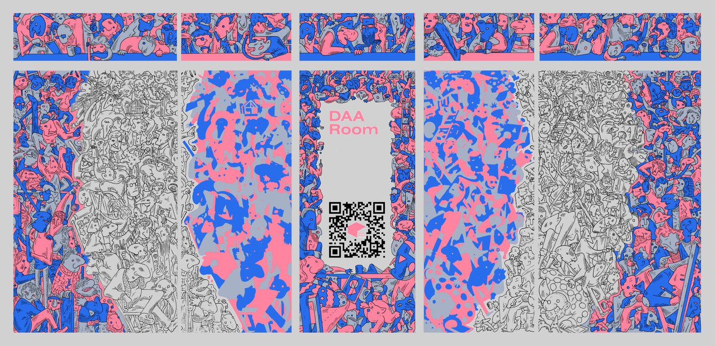 «DAA Room — это место для проф. комьюнити дизайнеров/архитекторов — место, располагающие к синергии и сотворчеству». На иллюстрации изображён целый мир, созданный творческим пространством.