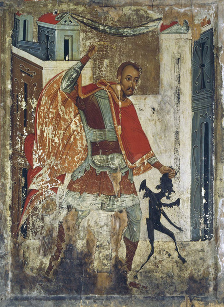 «Схватили юродивого и бить стали. А он кричит: поскребите ее, поскребите! Обидчики стали разглядывать разбитую камнем икону. И под ликом Богородицы увидели вторую краску. Черным по красному изображены черти и дьявол», — повествует житие святого [1]