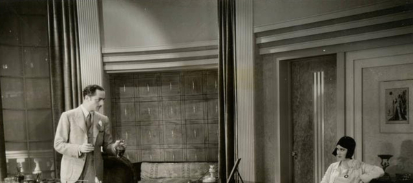 По обоим бокам сцены можно заметить тумбочки с ступенчатой структурой, на которых выставлены маленькие вазочки и растительные композиции демонстрирует характерное для ар-деко сочетание функциональности и декоративности.