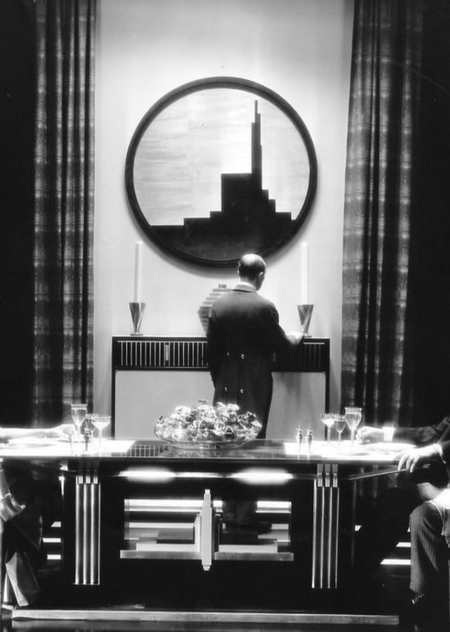 Вертикальный ритм, заданный элементом, напоминающим каннелюры, и поддержанный двумя полотнами с геометрическим узором, членящими остальное пространство пространство и элегантно подчёркивая чёрную статуэтку, визуально вытягивает пространство, создавая эффект большей высоты и лёгкости. Этот сознательный приём работает на создание характерной для ар-деко устремлённой вверх, облегчённой композиции.