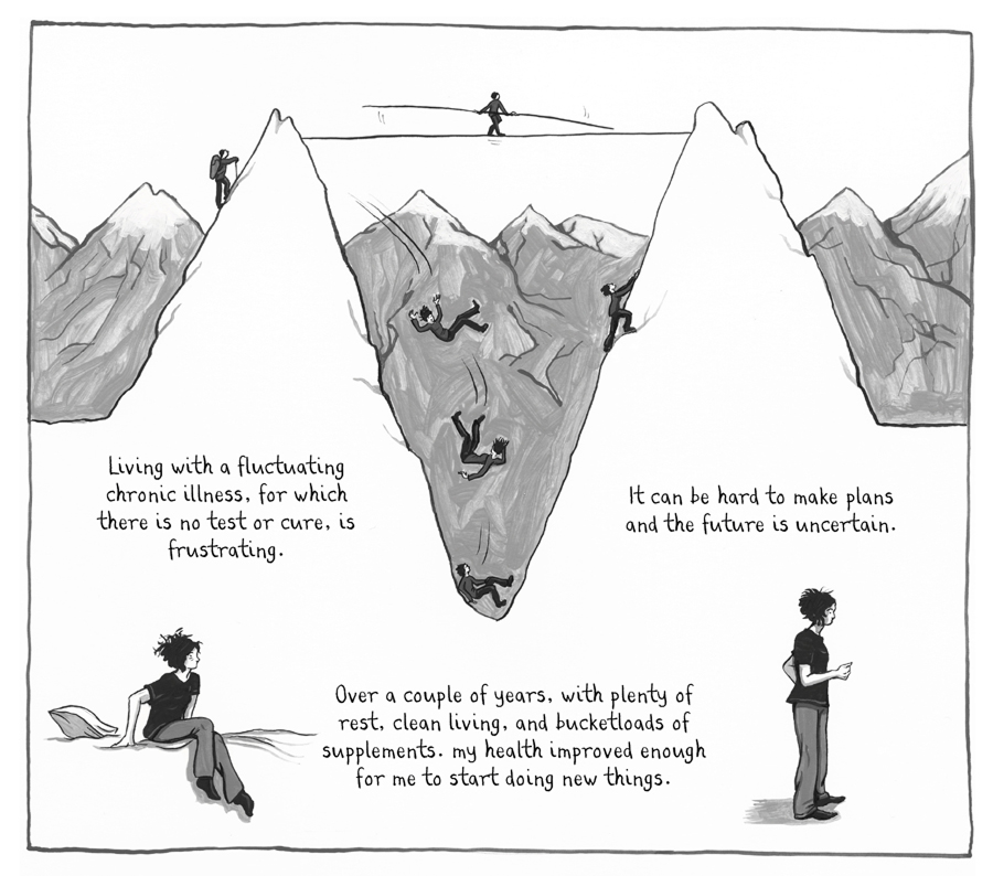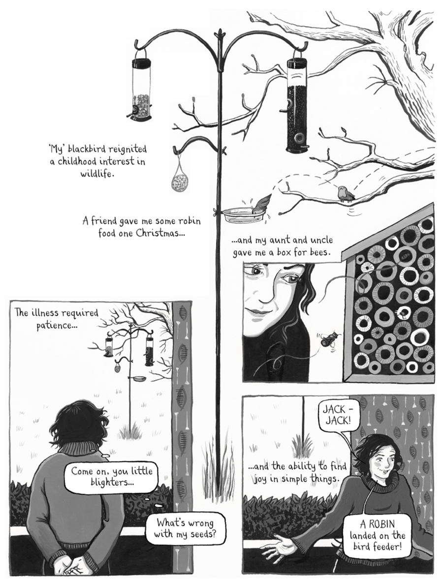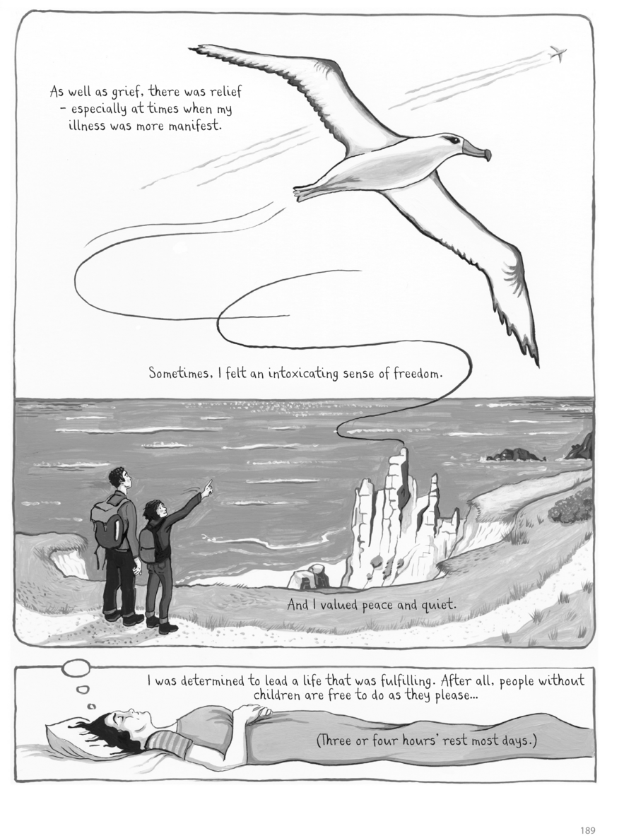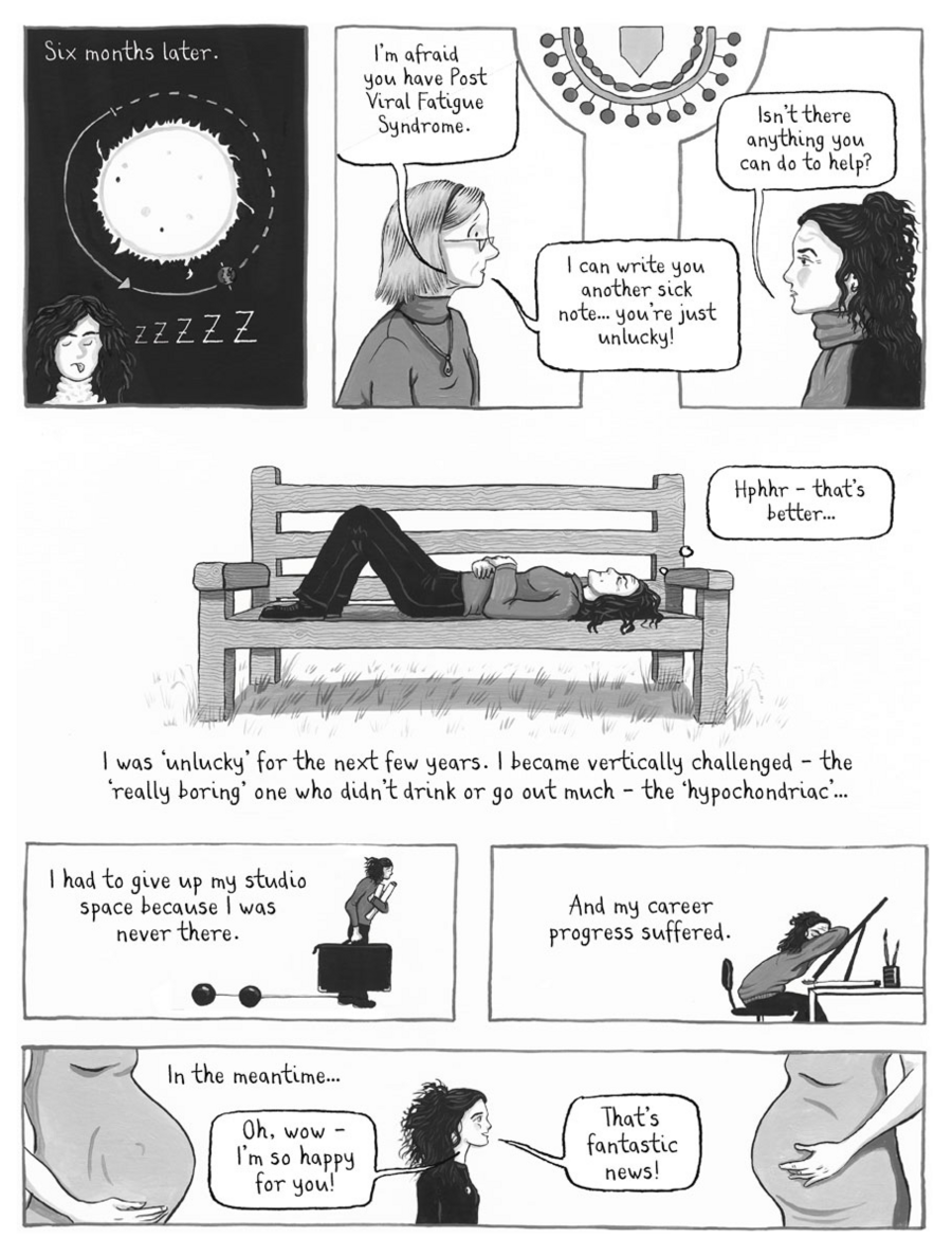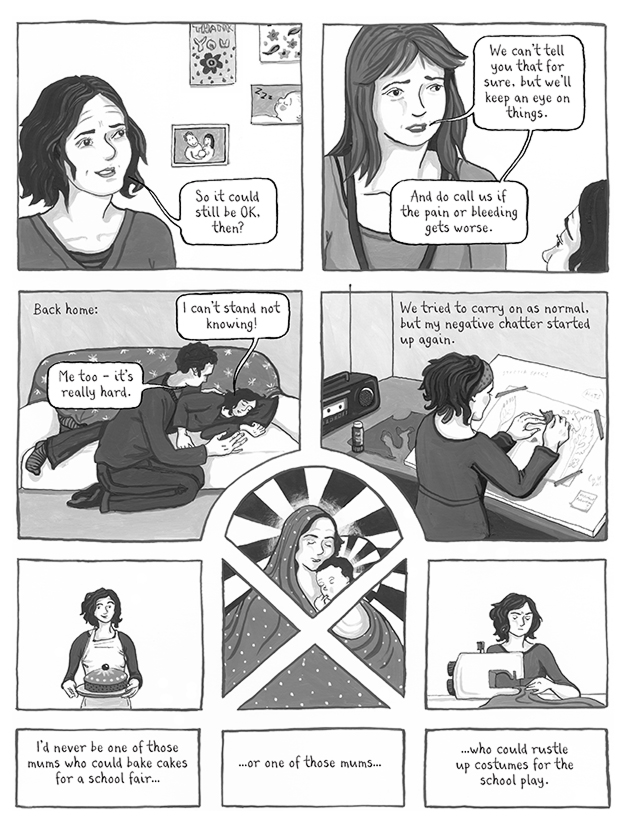 После выкидыша Найт изображает себя в виде эмбриона, лежащего внутри утробы. Эта мощная метафора передает глубокую регрессию, потребность в безопасности и уходе от мира, причинившего боль. Внешний мир в этой же панели представлен в виде банальных клише и соболезнований, которые не могут проникнуть внутрь ее скорби.