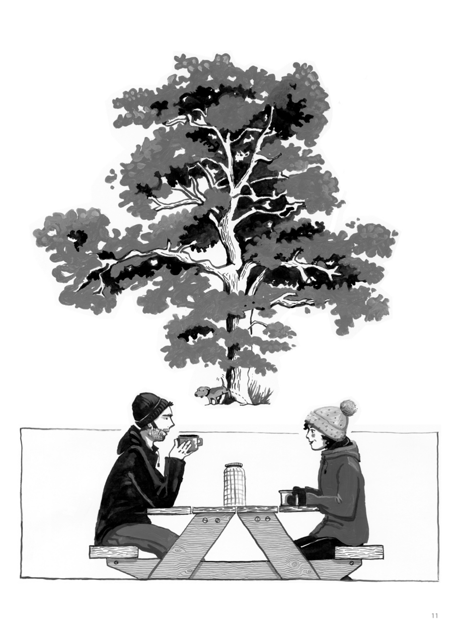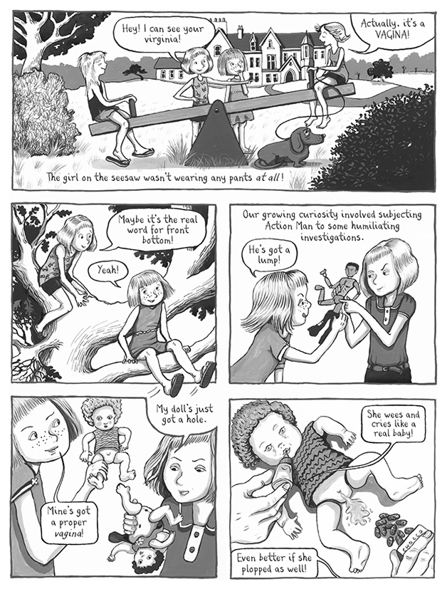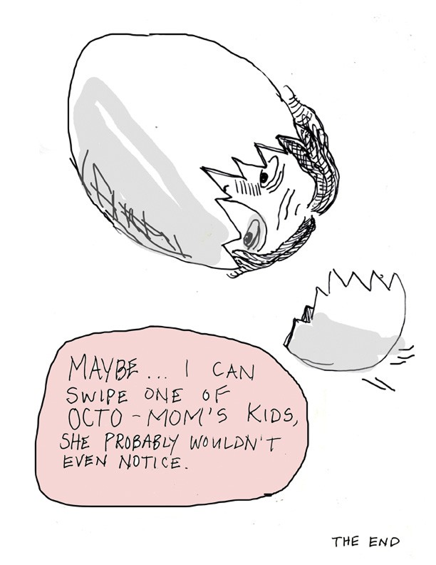 Поттс остроумно обыгрывает язык, которым с ней говорят. Фраза «Я так сожалею, что вы ПОТЕРЯЛИ ребенка!» визуально обыгрывается как абсурдная — она не оставляла ребенка в торговом центре. Это метафора того, как язык окружающих усугубляет травму, навязывая чувство вины и неадекватные нарративы.