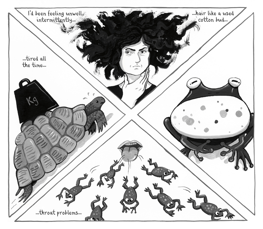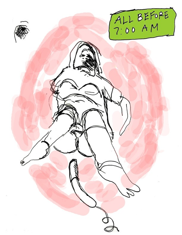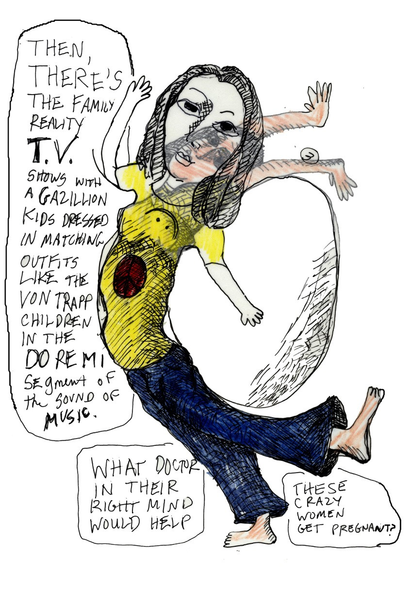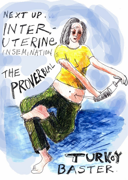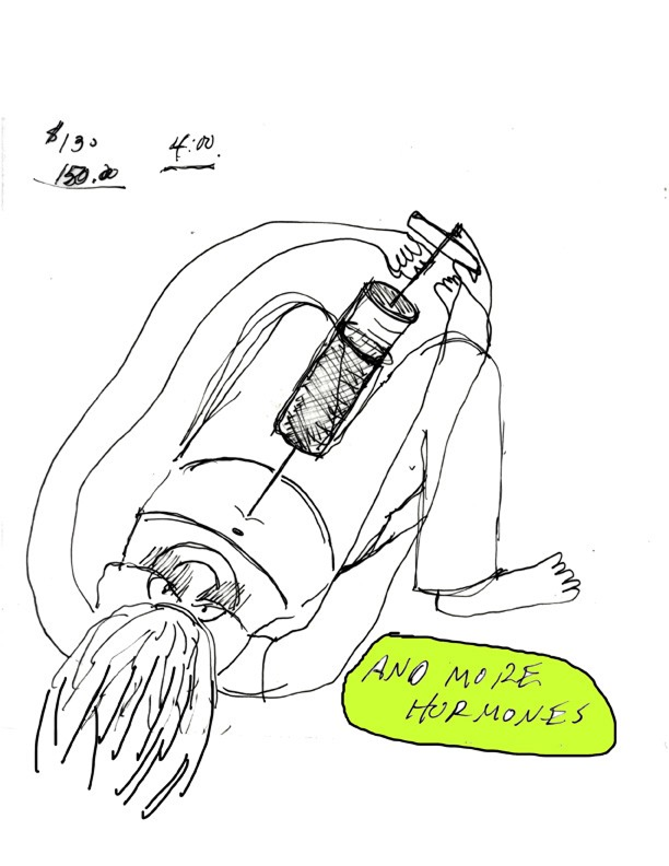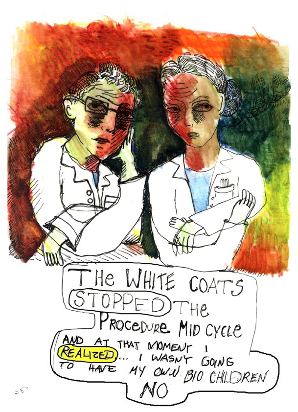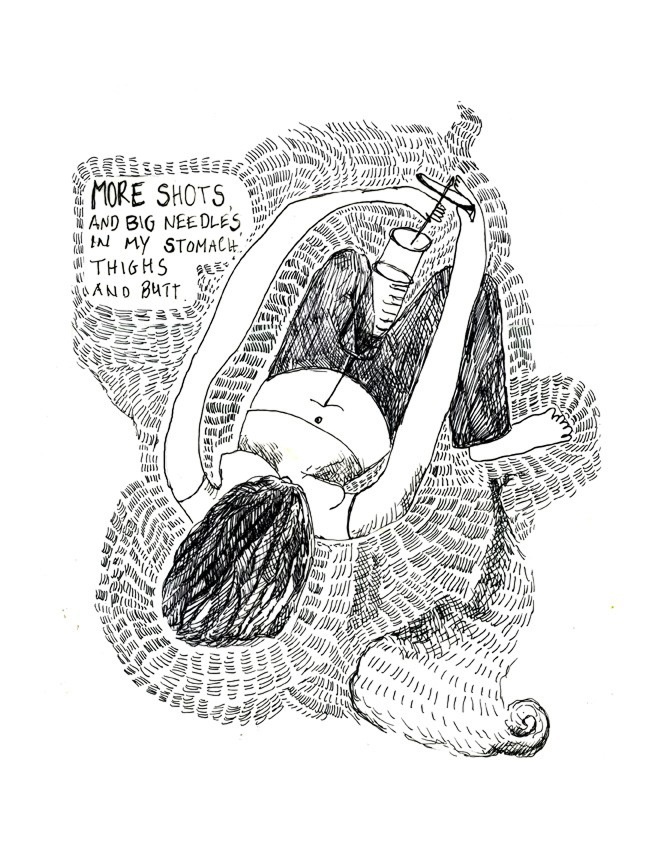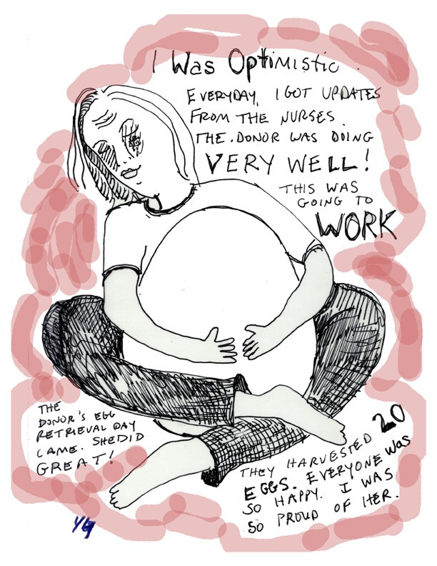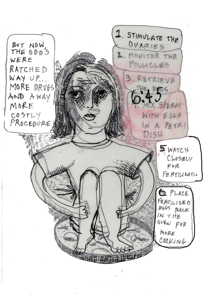Ее тело на рисунках растягивается, сжимается, деформируется под давлением процедур. На изображении внутриматочной инсеминации ее тело растягивается, пытаясь «вместить» сюрреалистичность происходящего. Это визуальная метафора насилия, которое медицинская система совершает над телесным и эмоциональным «Я».