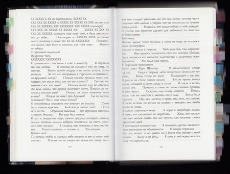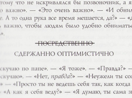 Стирание текста и повторы: белые листы, которые «специально оставлены пустыми», ритмичные повторы одних и тех же фраз дают читателю свежего воздуха на собственные мысли, передают абсолютную пустоту в душе героя и любого человека, пережившего такую трагедию. Книга будто дышит, в ней очень много воздуха и света, несмотря на кромешный ужас ситуации.