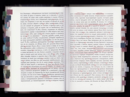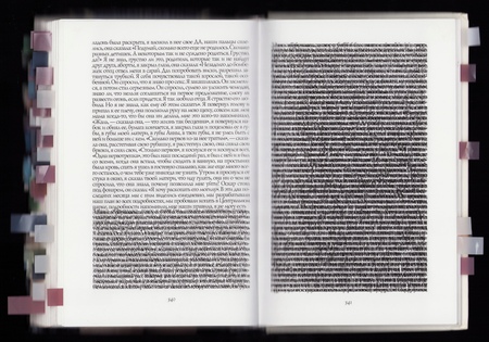 Эксперименты с плотностью текста: «уплотнение» и наложение строк передают смятение и нарушение коммуникации, необычные решения с заполнением страницы создают ощущение полнейшей путаницы и дезориентации.