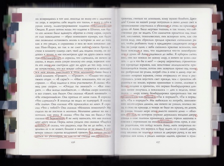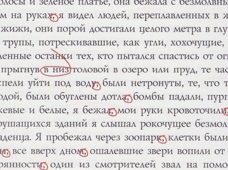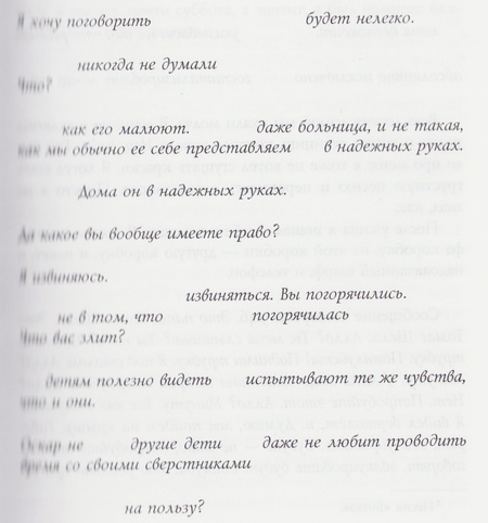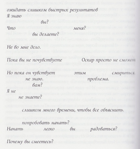 Джонатан Фоер активно экспериментирует с типографией, тем самым добавляя экспрессивности тексту. Эти приемы не только обогащают семантику текста, но и делают читателя активным участником. Ниже рассмотрим отдельные техники на примерах.