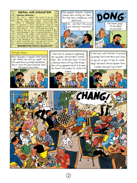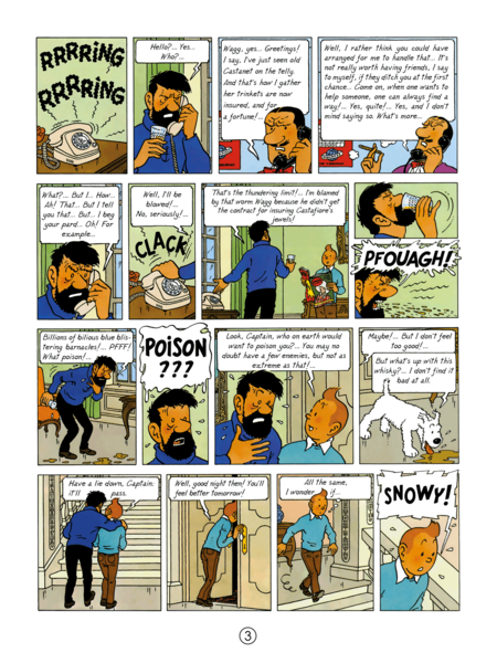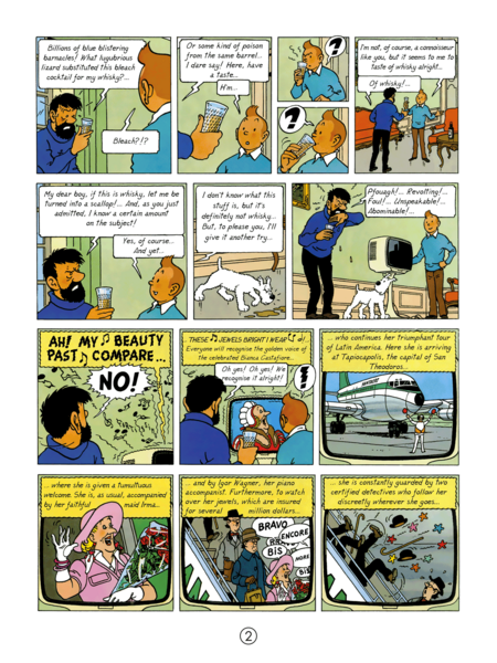 В «Секрете Единорога» серии приключений Тинтина мы видим классическую сетку 3×4 (12-панельную страницу). Это почти равные по высоте панели, отсутствие крупных вертикальных кадров или сцен без рамок, что приводит к равномерности ритма, как при чтении текста, легкому следованию за сюжетом. Эрже практически всегда использовал стандартные прямоугольные панели, показывающие действия героев и развивающие сюжет.