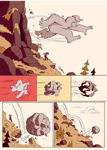Как мы видим из вышеприведенных примеров, авторы комиксов для детей используют разные композиций в зависимости от задачи: это может быть и последовательное повествование, и герой, как центр кадра, и отсутствие четкой структуры, как можно увидеть на примере некоторых книг «Хильды». Фреймы могут быть разного размера и компоновки, а некоторые страницы с изображением на весь разворот без текста. Это тоже эффективный прием, чтобы увлечь юного читателя, ведь он не знает, какой сюрприз его ждет на следующей странице. Работая с композицией, авторы могут создавать эффект приключения: ощущение движения, вертикальные композиции для изображения высоты/опасности, горизонтальные — для путешествия и дороги. Кроме того, используя разный размер панелей можно переключаться от пейзажных зарисовок в больших к динамичным в маленьких.
