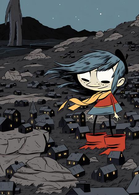 В комиксе «Hilda and the Midnight Giant» мы нередко видим атмосферные широкие панорамы или иллюстрации на всю страницу. Внимание читателя направляется на пейзаж, масштаб, мы видим маленькую героиню и гигантского великана. Автор как бы подчеркивает в какой огромный мир вписан маленький персонаж.