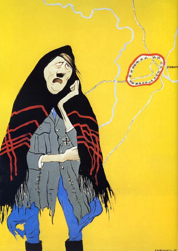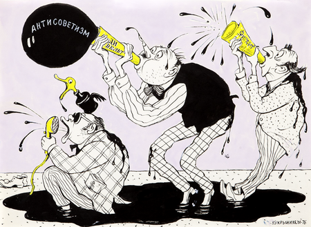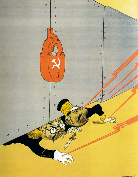 Советский графический дизайн довольно сложно представить без творческого объединения «Кукрыниксов», которые охватывало широкие горизонты изобразительного искусства, но в первую очередь прославилось своими политическими карикатурами, которые едко и точно обличали и принижали советского врага. С таким подходом, коллектив быстро снискал свою славу, в том числе, со стороны власти, благодаря очень живому и выразительному визуальному языку, который помогал легко и задорно считывать сатиру каждому человеку.