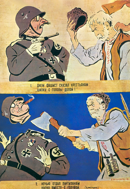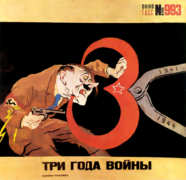 [1] Кукрыниксы, «Долг платежом красен. Окно ТАСС», 1941 г.; [2] Кукрыниксы, «Три года войны. Окно ТАСС», 1944 г.;