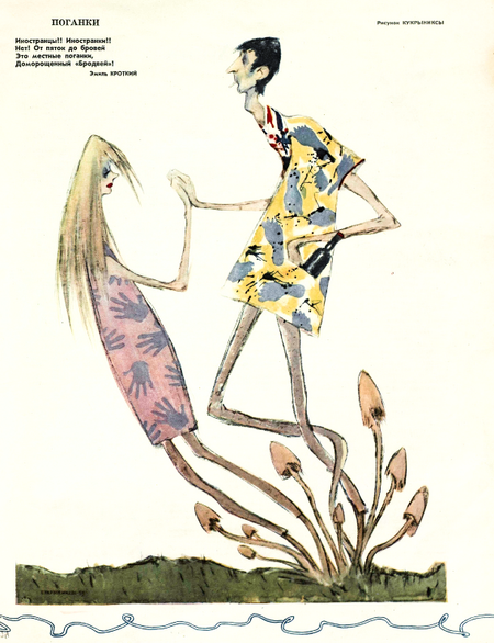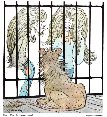 Карикатуры на стиляг. [1] Кукрыниксы, «Мне бы такую гриву!», 1974 г.; [2] Кукрыниксы, «Поганки», 1959 г.