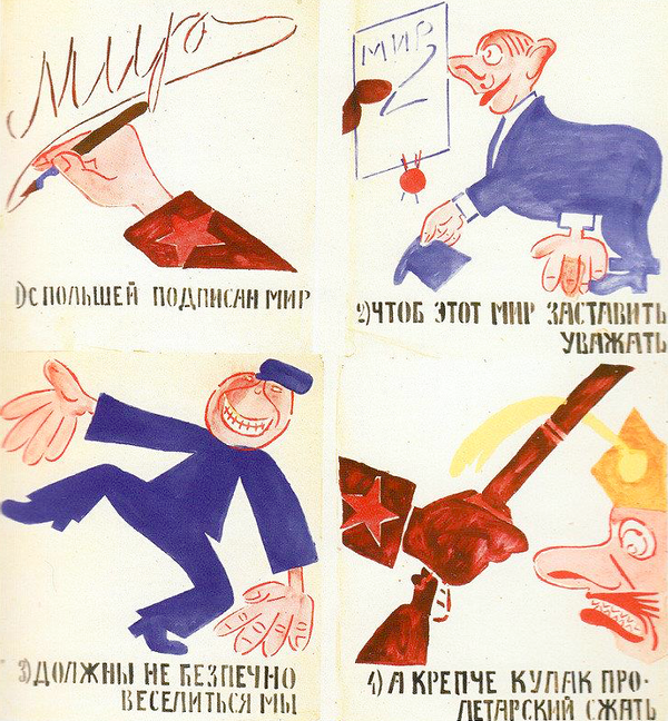 [1] Владимир Маяковский, «„С Польшей подписан мир“, около 1919 г.; [2] Кукрыниксы, „Били мы врага копьем…“, 1941 г.