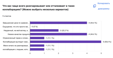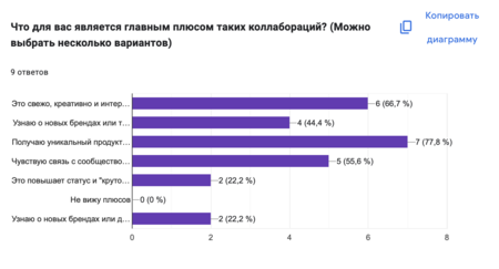 Результаты опроса показывают, что основные преимущества коллабораций потребители видят в эмоциональной составляющей — связи с брендом и уникальности продукта, тогда как главными барьерами становятся практические аспекты: завышенная цена, ограниченный тираж и навязчивый маркетинг. Это создает противоречие между эмоциональной ценностью и рациональными препятствиями для покупки.