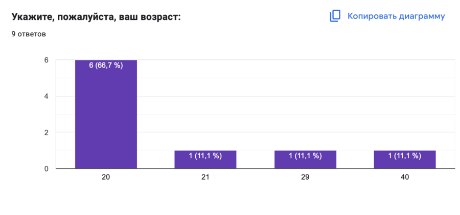 Выборка была ограничена возрастной группой 18–25 лет, поскольку именно эта аудитория проявляет наибольший интерес к современному искусству. Для молодёжи искусство служит инструментом формирования идентичности и самовыражения, что и обусловило её релевантность для нашего исследования. В дальнейшем мы бы хотели исследовать эту же тему, опираясь на взрослую целевую аудиторию и на детей.