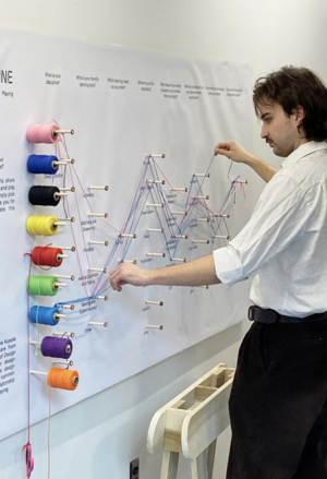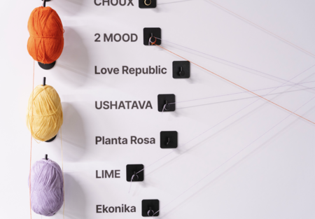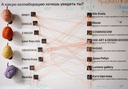 Посетители с помощью ярких нитей соединяют бренды из первого столбца с творческими сообществами из второго. Это наглядно покажет, какие коллаборации могли бы быть наиболее интересны публике, даст живую вовлеченность и мгновенную аналитику.
