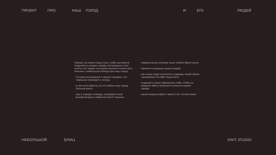 Для брестчан, которые согласились принять участие в моем исследовании, я подготовила презентацию с вопросами о нашем городе, над которыми мы вместе размышляли. Многие из ответов останутся в личном диалоге, с помощью них мы смогли подготовить выводы к гипотезе исследования.